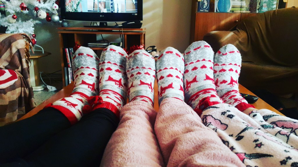 After breakfast all together, parents started cooking (dad cooking, mum assisting), the three of us sat on the sofa watching Christmas films wearing our new Christmas socks, an annual sisterly tradition and Oscar is now sitting next to me, begging for cuddles.