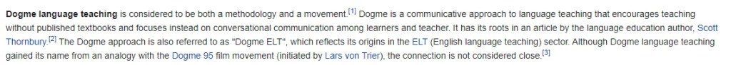 A few months ago I had no clue what a ‘dogme’ lesson was. When I first heard the term I thought it was something related to either dogs or dogma. Very baffling.