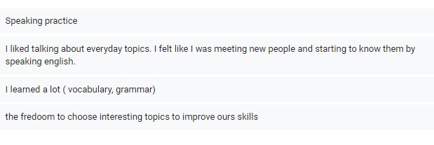 I find it hard to put into words how it felt to run such a lesson but I’ll try. I was terrified to begin with, but as soon as we started, time flew by and I somehow found ways to facilitate the lesson and provide as much content and language feedback as possible. My students wanted to focus on speaking, so I left it to them to come up with topics. We had 3 pair and group speaking sessions, first each pair or group discussing a separate topic, then focusing on just one. For all the activities I monitored and made notes on good language used as well as language they could improve/express better (which they did) and asked the students to try and use that language on the following activities.