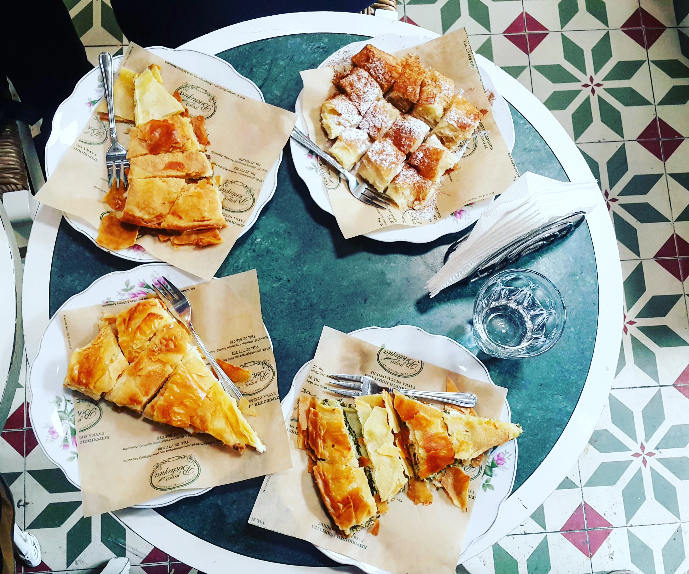 We went for spanakopita (spinach filled pastry), kotopita (chicken), tiropita (cheese) and the traditional mpougatsa me krema (sweet cream).