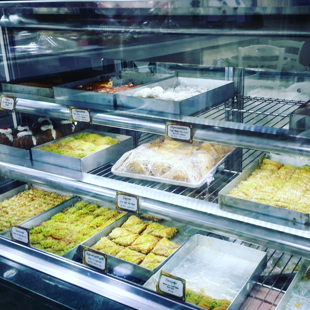 Freshly made bougatsa (Greek breakfast/snack pastry) and pita (pastries not pita bread) with savoury (spinach, cheese, chicken) and sweet fillings (the traditional and infamous sweet and full of cream), other Greek traditional pastries such as tsoureki (sweet bread) and kourou (mini pies) and desserts, many, many desserts from simple cakes to complex chocolate puddings.